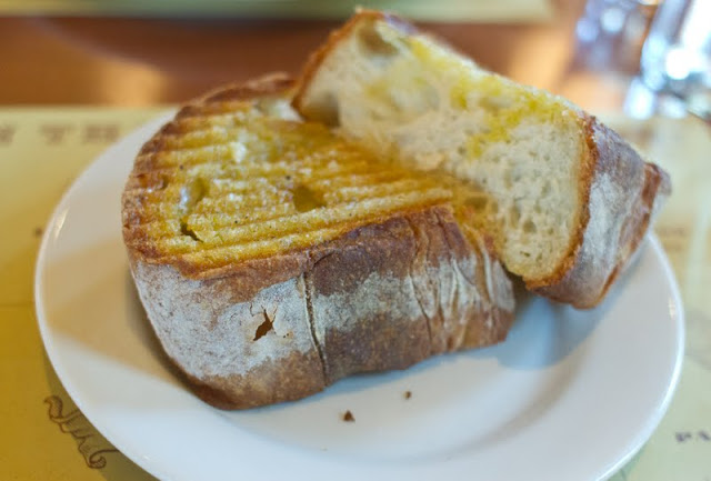 On this, very first encounter with Mozza, I can only vividly remember a few items we ate. The rest blurs together in a haze of deliciousness and excess. First, the bread arrives at our table. Mozza is best known for their Pizza, but honestly I could go there and just eat the bread. An order of Pane Bianco came first with four shiny pieces. The olive oil soaked bread with chunks of sea salt was not only visible but glistening in the afternoon light. We each took a piece of bread from the plate and sat in silence, quickly devouring our pieces. We immediately placed another order of bread with the next server to pass by us.