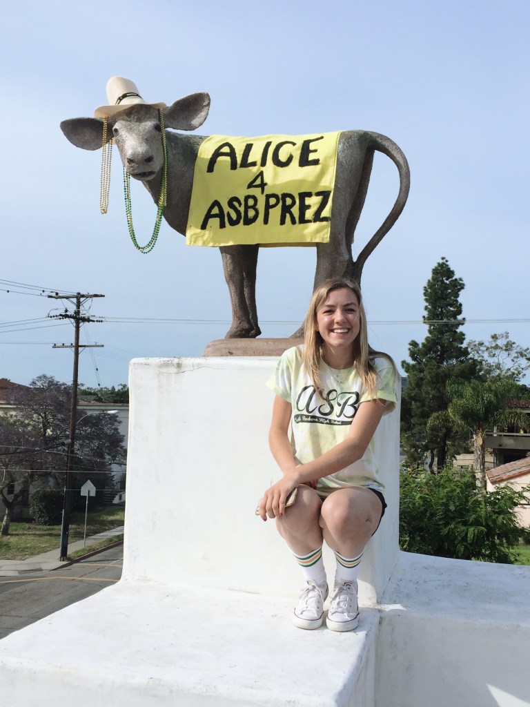 Coming from a small private school, (just like me!), Alice had never had an outlet for leadership, so in high school ASB became her domain. She was successful in her first year and thrived off the power (small but enough), in which she watched her ideas come to fruition. After that, she ran for the highest position in every subsequent election. She lost them all.
